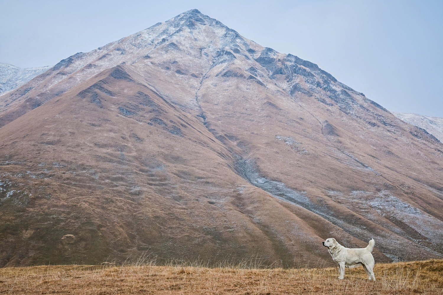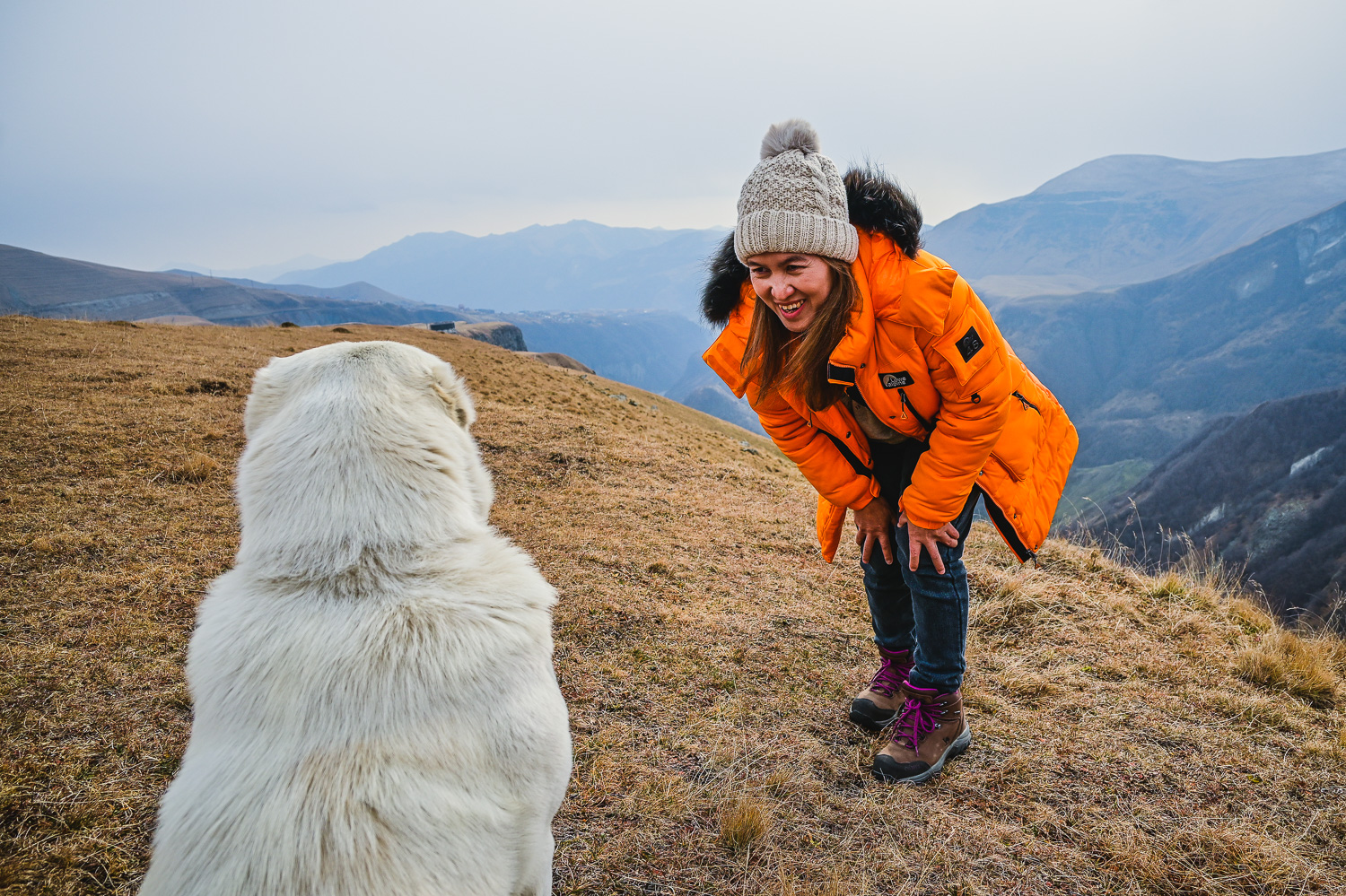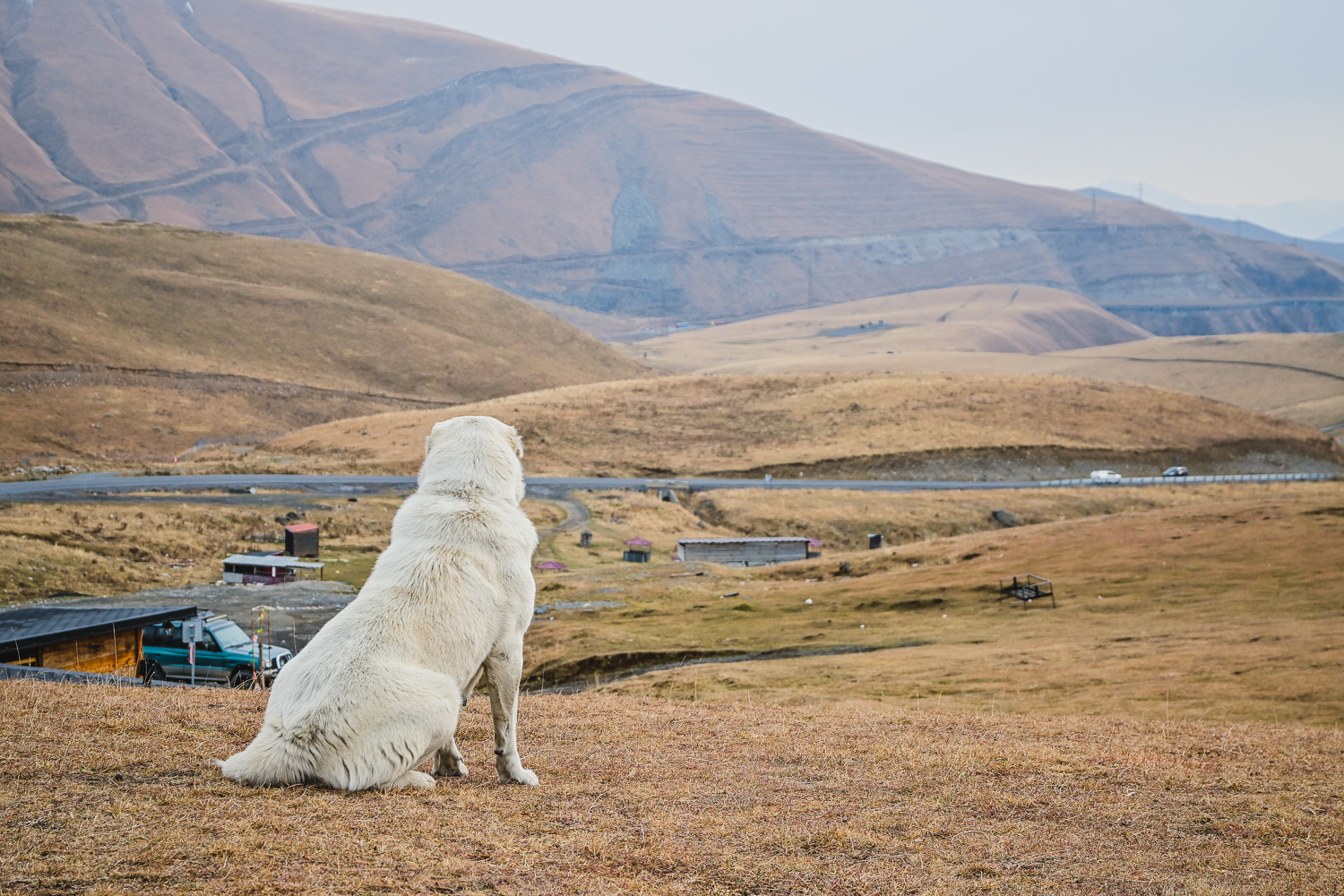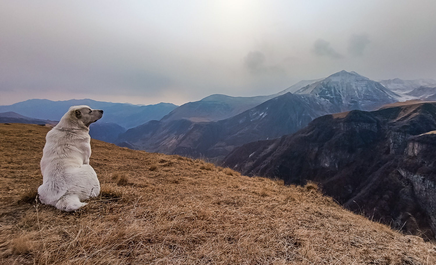There was a light dusting of snow after the night’s fall early on, but by mid-morning it had started to melt on the lower peaks. The higher mountains were blanketed, however, so we ventured back to the Gudauri lookout, which wasn’t packed with selfie seekers, for some more shots of the valley and Caucasus. We were met at the Mount Sherkhota lookout by the resident dog, which looked more like a polar bear in this weather, and was happy for the company.