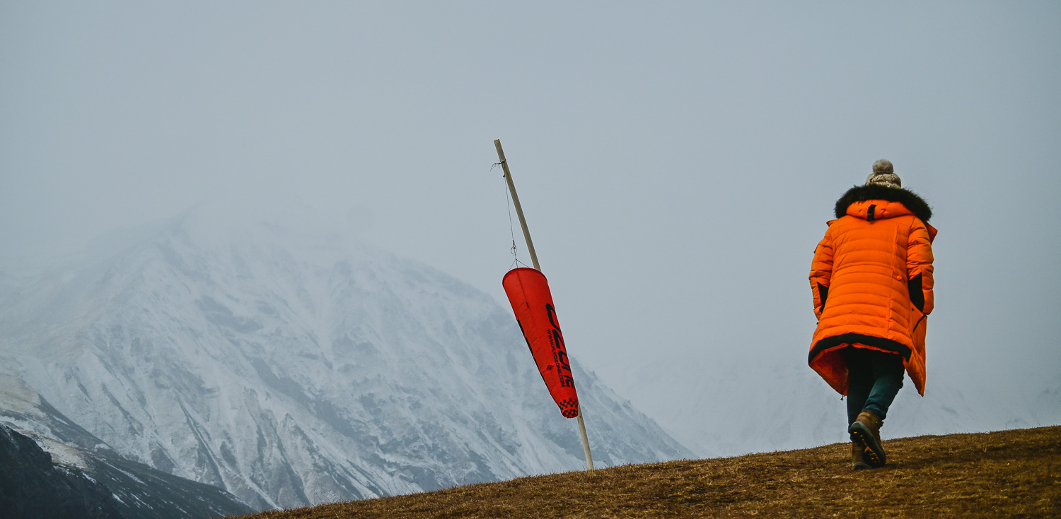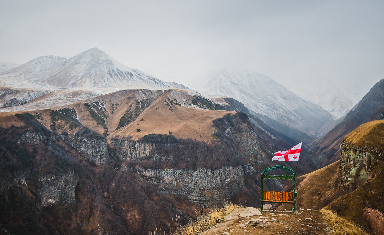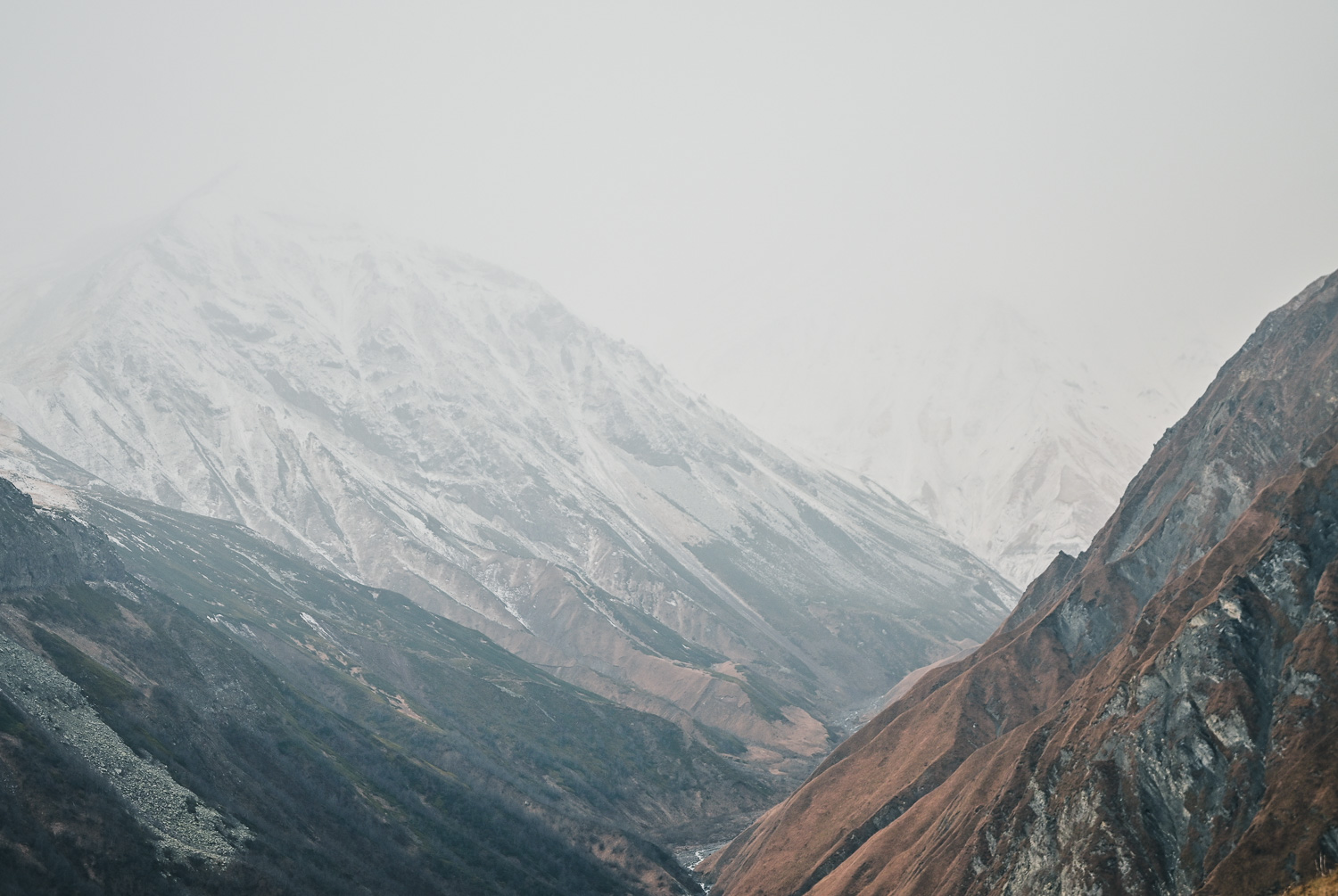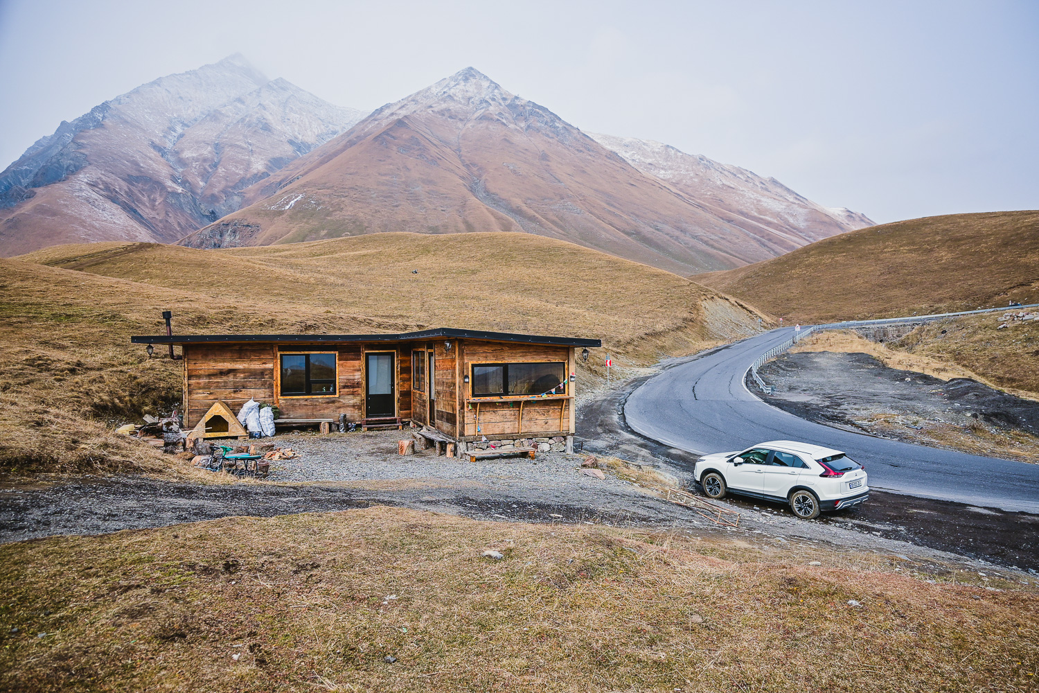 There was a light dusting of snow after the night’s fall early on, but by mid-morning it had started to melt on the lower peaks. The higher mountains were blanketed, however, so we ventured back to the Gudauri lookout, which wasn’t packed with selfie seekers, for some more shots of the valley and Caucasus. We were met at the Mount Sherkhota lookout by the resident dog, which looked more like a polar bear in this weather, and was happy for the company.