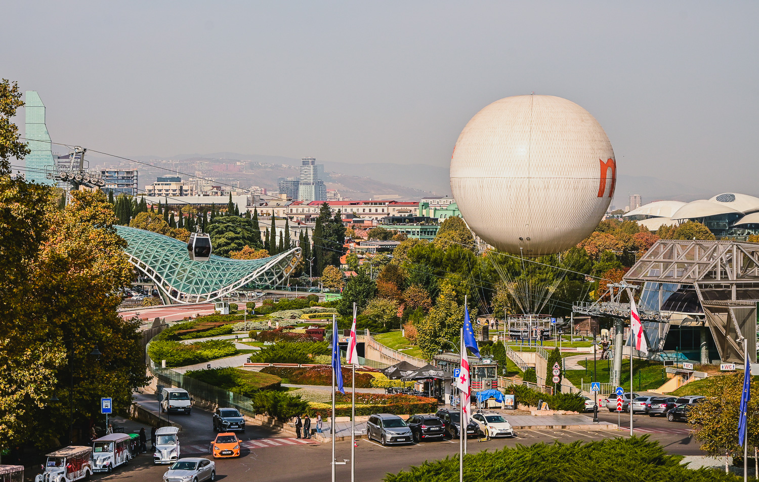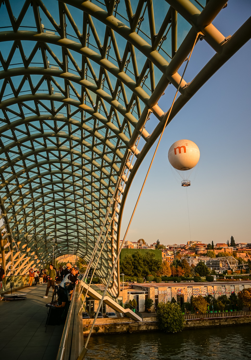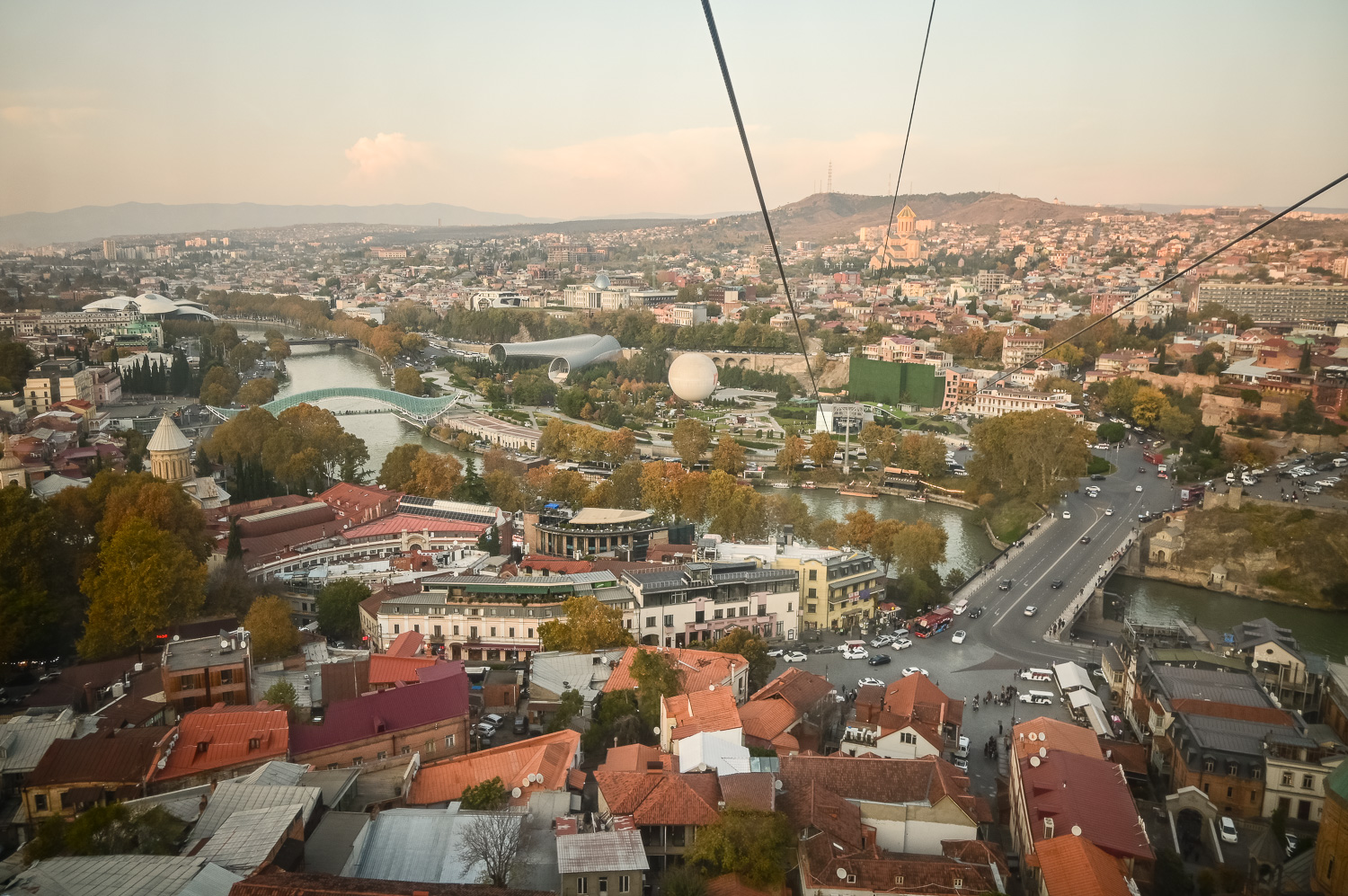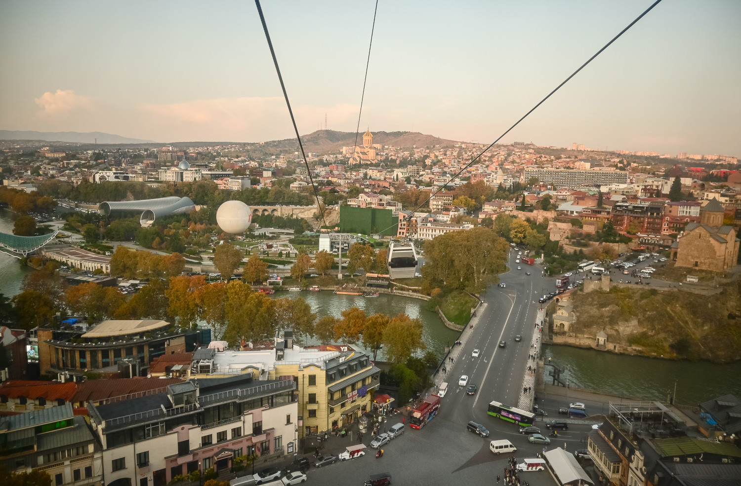 It was time for a rest and a vino on the balcony before we headed out again in the late afternoon, walking across the pedestrian Bridge of Peace over to the ropeway (cable car) to take us up to the Mother of Georgia for a dollar at sunset.