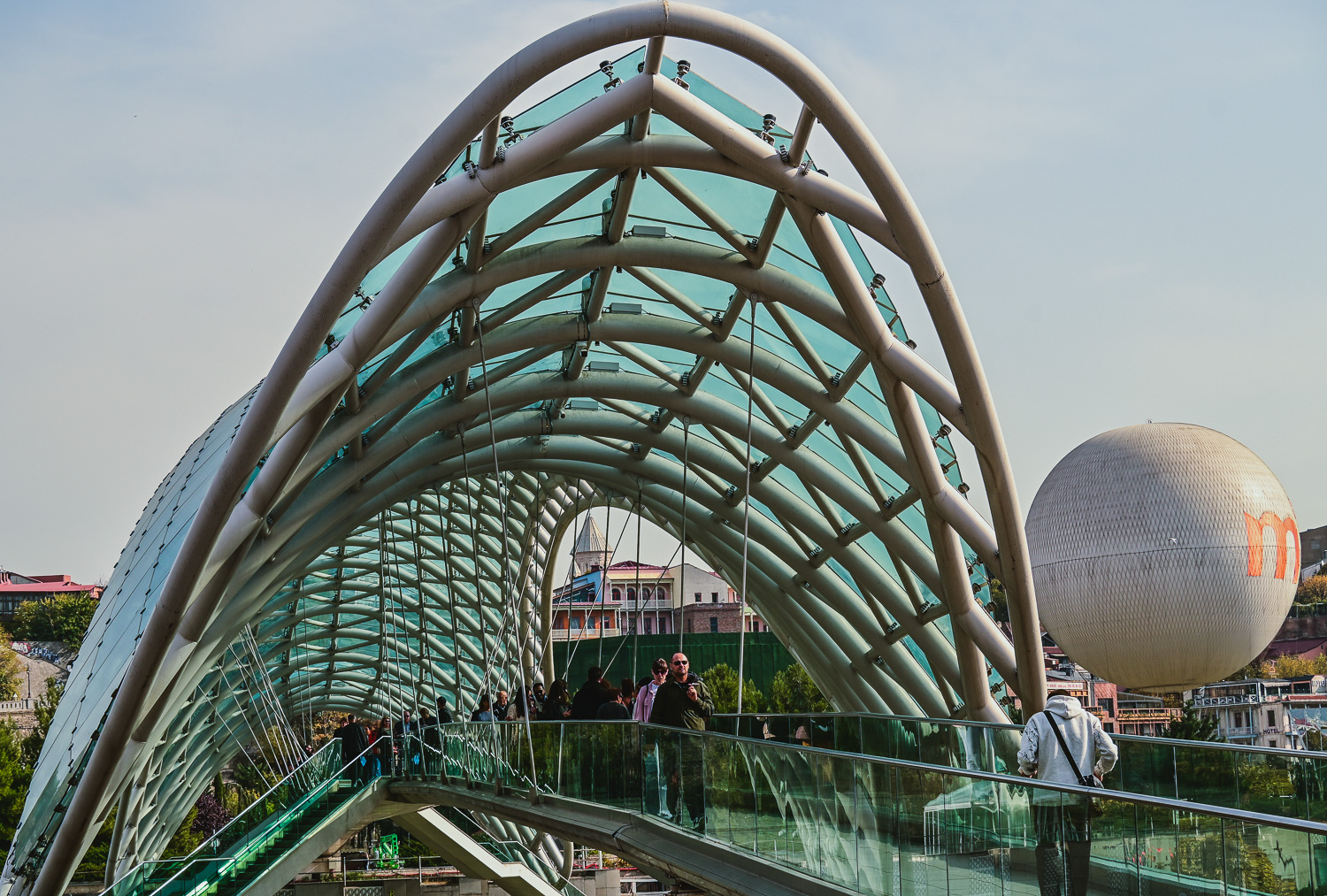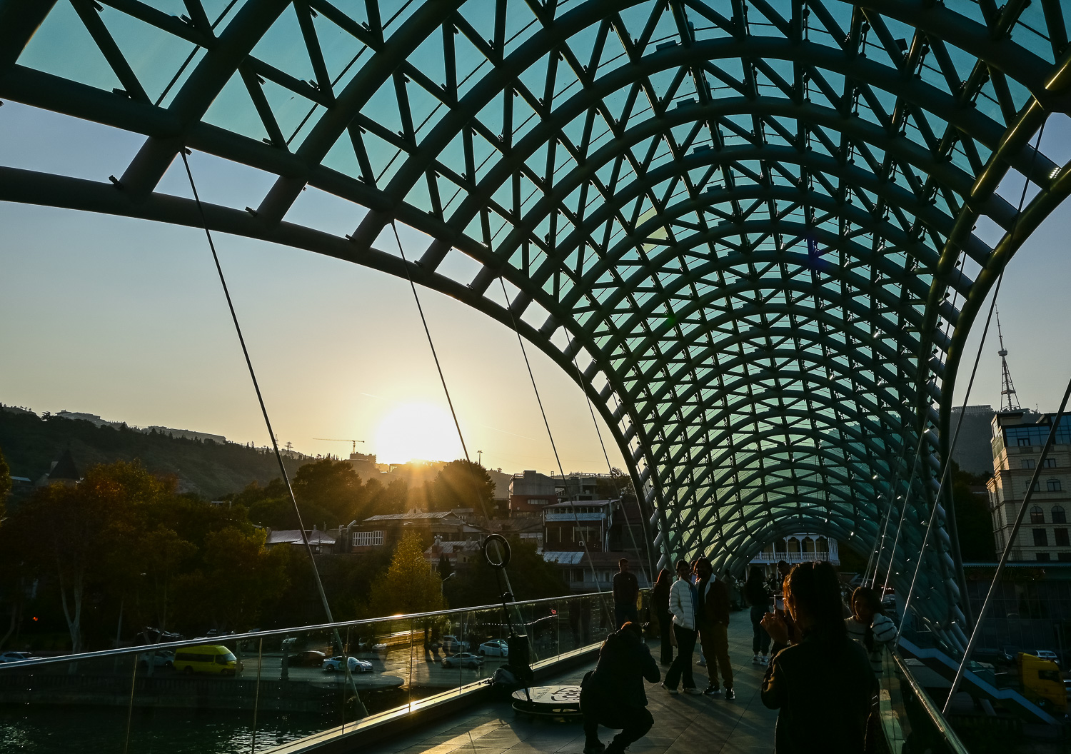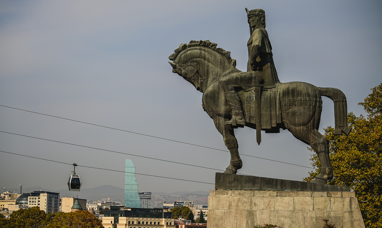 It was time for a rest and a vino on the balcony before we headed out again in the late afternoon, walking across the pedestrian Bridge of Peace over to the ropeway (cable car) to take us up to the Mother of Georgia for a dollar at sunset.